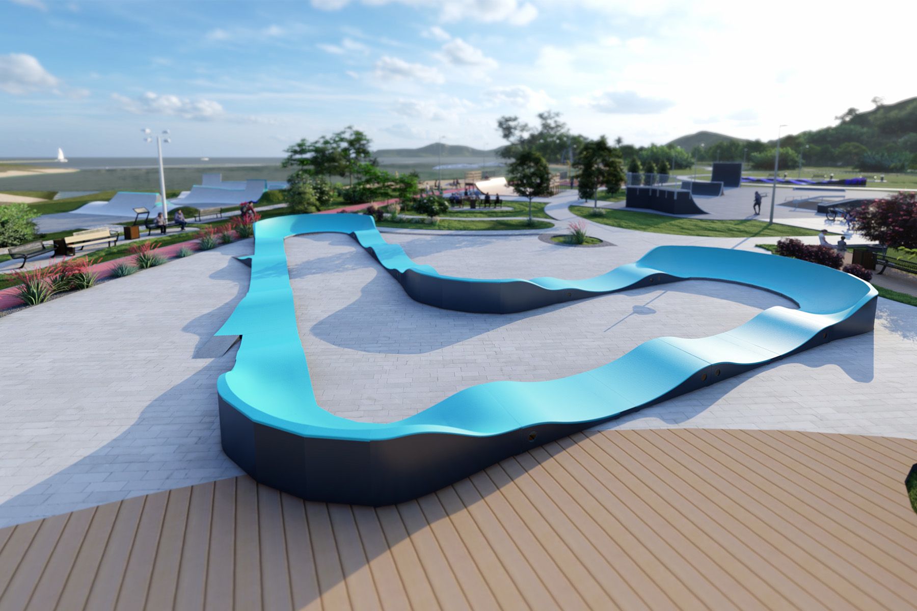 La Pumptrack glacier TF008, d'une longueur de 65 m, est une piste cyclable modulable conçue pour les vélos, les skateboards, les patins à roues alignées et les trottinettes. Le tracé de la piste est basé sur un enchaînement rythmé de bosses et de virages qui permettent de maintenir la vitesse en faisant travailler le corps de manière adéquate, sans avoir à pédaler ou à pousser. Grâce à sa géométrie claire, la piste est intuitive et convient aussi bien aux débutants qu'aux utilisateurs plus avancés.