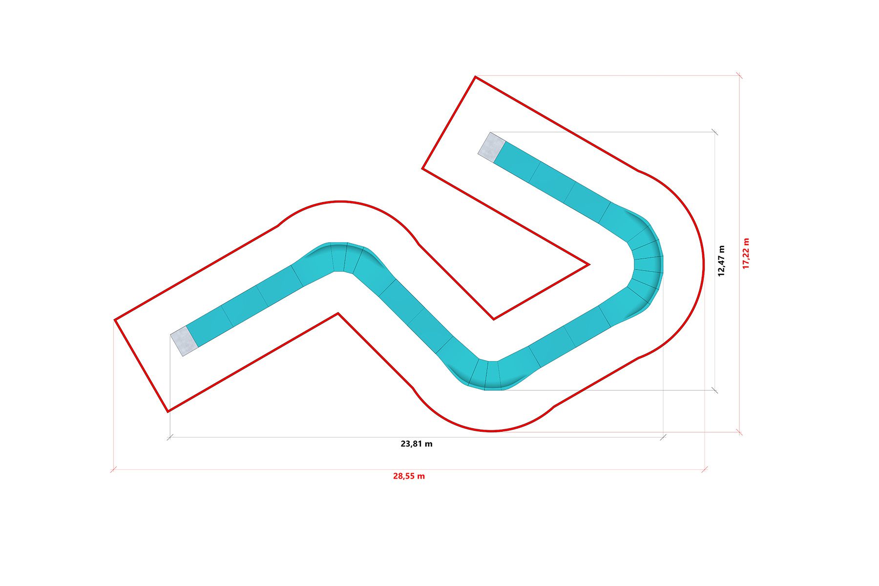 Le Line Series Pumptrack LF004, d'une longueur de 38,6 m, est une piste compacte conçue pour une conduite dynamique et souple à vélo, en skateboard, en roller et en trottinette. Le tracé de la piste est basé sur une séquence de vagues et de courbes douces, qui permettent de maintenir la vitesse grâce à un travail corporel approprié, sans avoir besoin de pédaler. Grâce à sa ligne de déplacement claire, la piste est idéale pour les premiers essais de conduite et pour l'apprentissage des techniques de base.