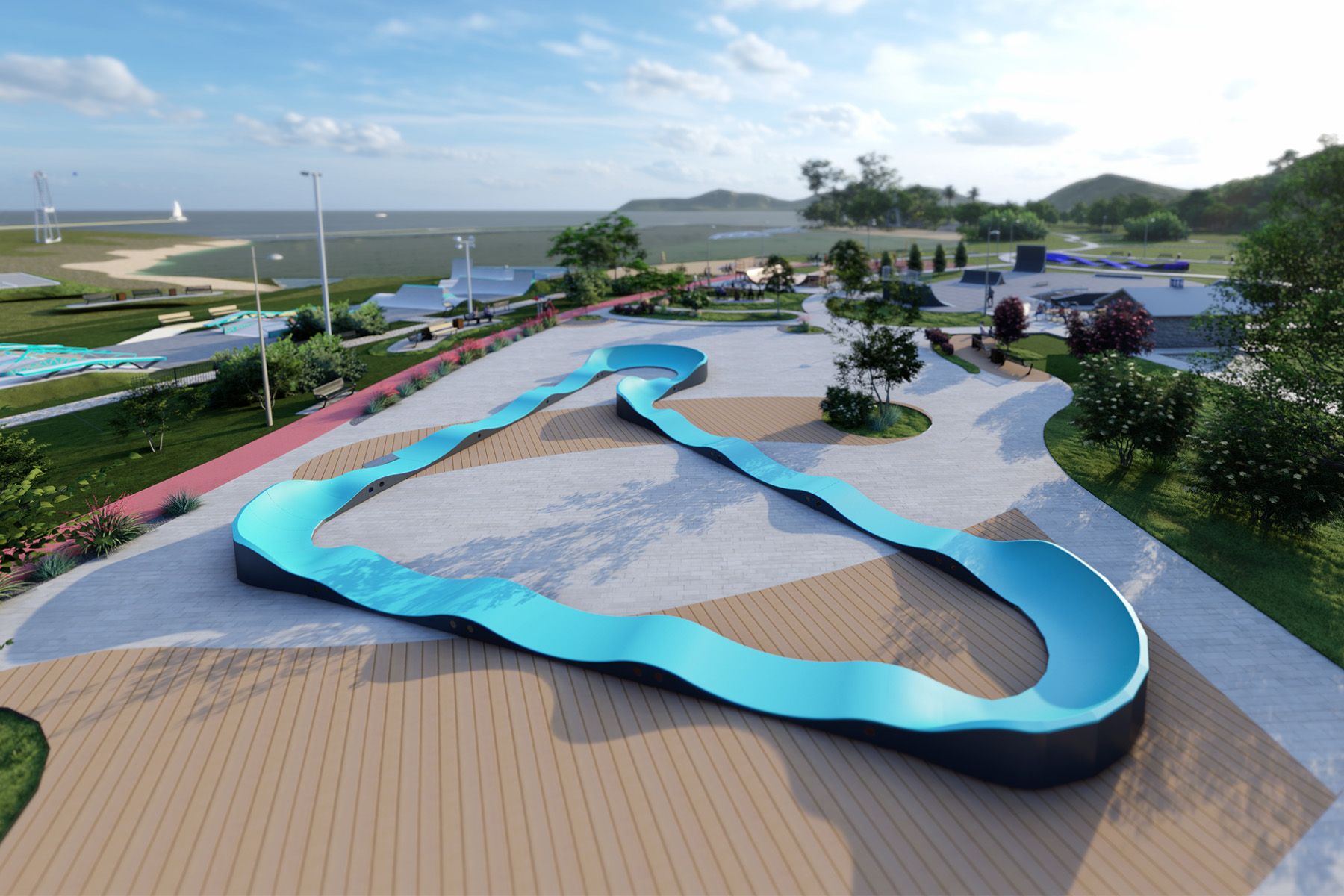 La PUMPTRACK OCEAN Pumptrack, d'une longueur de 70 mètres, est une piste cyclable modulaire conçue pour les vélos, les skateboards, les patins à roues alignées et les trottinettes. Le tracé de la piste est basé sur une séquence rythmée de bosses et de virages qui permettent de maintenir la vitesse en faisant travailler le corps de manière adéquate, sans avoir à pédaler ou à pousser. Grâce à sa géométrie claire, la piste est intuitive et convient aussi bien aux débutants qu'aux utilisateurs plus avancés.
