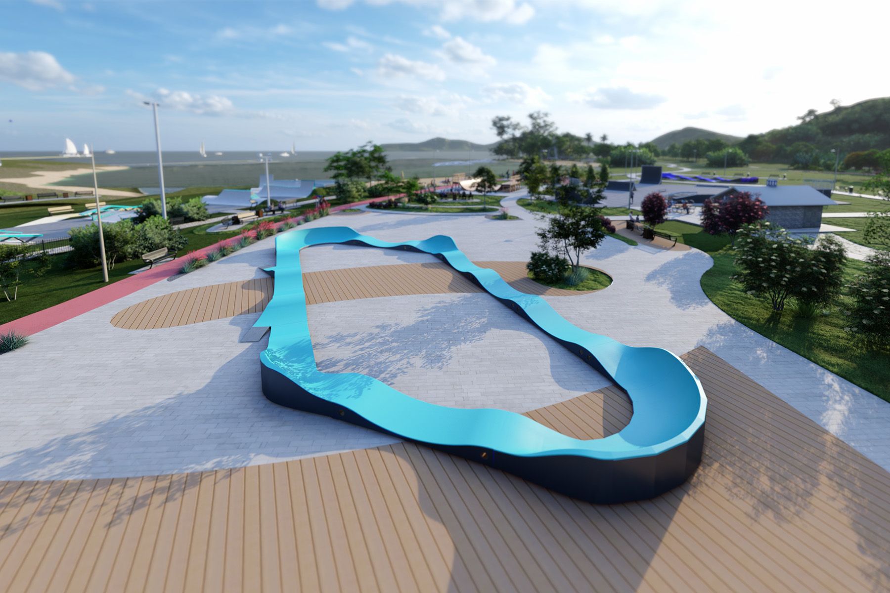 La Pumptrack VALLEY TF006, d'une longueur de 60 m, est une piste cyclable modulaire conçue pour les vélos, les skateboards, les patins à roues alignées et les trottinettes. Le tracé de la piste est basé sur un enchaînement rythmé de bosses et de virages, qui permet de maintenir la vitesse par un travail corporel approprié, sans avoir à pédaler ou à pousser. Grâce à sa géométrie claire, la piste est intuitive et convient aussi bien aux débutants qu'aux utilisateurs plus avancés.
